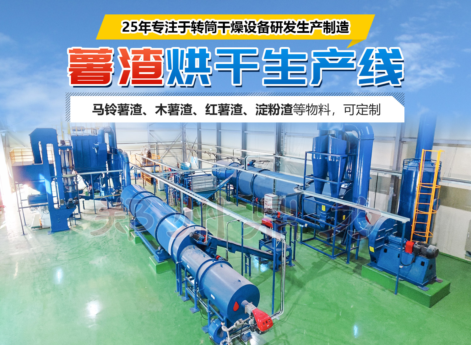 薯渣烘干機流程是:水分80-85%物料先經過專用脫水機,水分脫除到68%左右,由螺旋輸送機送入攪拌滾筒烘干機實現順流烘干,薯渣在抄板下不斷抄起、散落呈螺旋行進式前進,內置攪拌槳葉裝置將物料充分攪拌打散破碎,充分擴大物料與熱氣熱交換面積,物料與熱氣充分質熱交換,水分迅速蒸發汽化,達到35%左右,完成滾筒干燥過程,由螺旋輸送機排出,進入半濕物料專用粉碎機,粉碎物料粒度到1mm以下,進入脈沖氣流烘干過程,物料迅速降到12%以下。(可避免物料在烘干過程中糊化、糖化現象發生,造成物料外觀顏色發黑),由旋風卸料器和脈沖袋式收塵器回收干料粉,廢氣達標排放,完成整個烘干過程。滾筒內部安裝有震打清理裝置,防止物料與筒壁粘接。