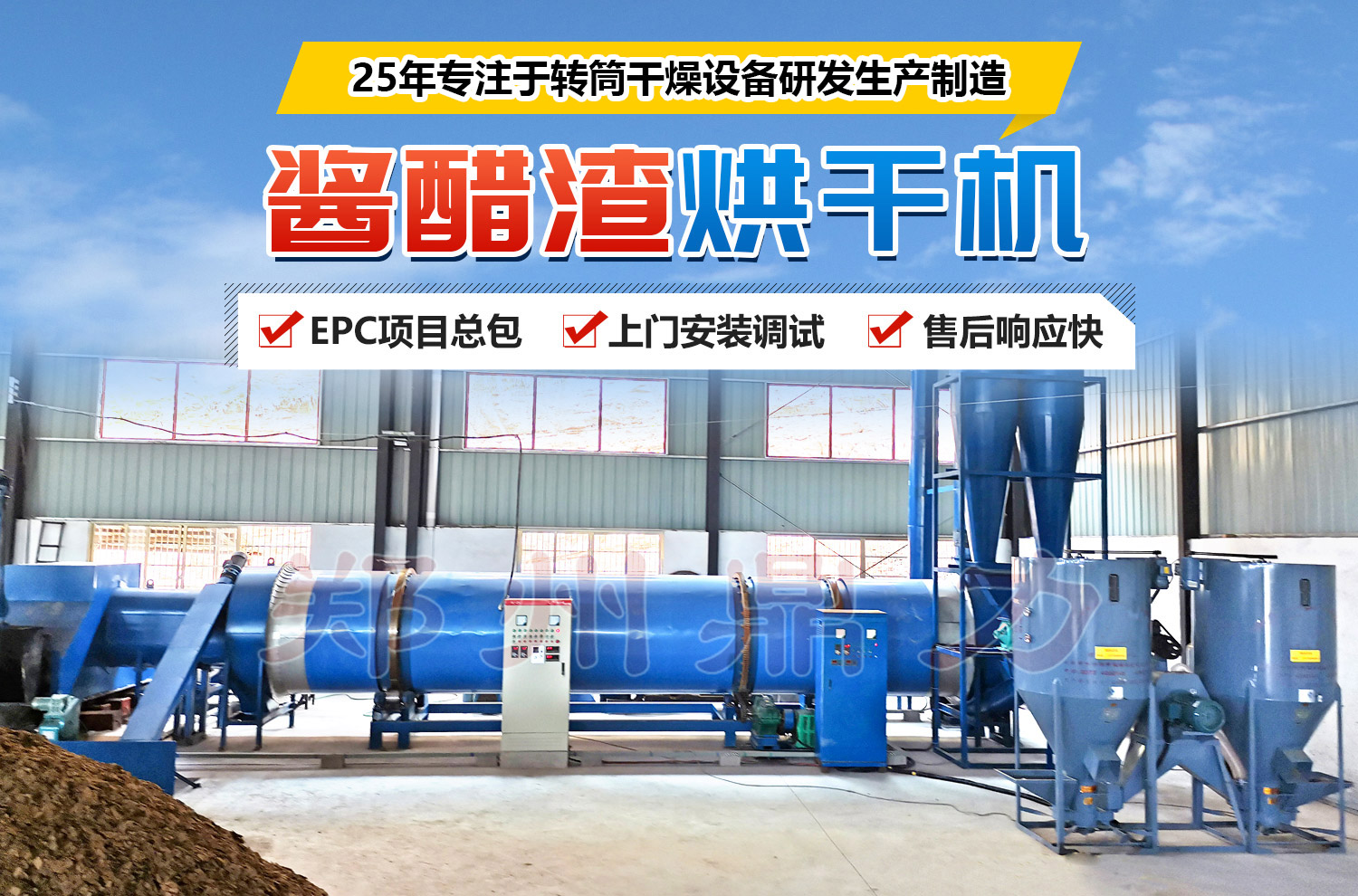 醬渣烘干機可將含水分65-75%的醬渣,快速烘干至含水分13%以下的干成品。該機組以煤 (天燃氣、煤氣)為能源,用熱風為干燥介質,利用強熱風對各類濕物料進行熱瞬間差的高溫快速烘干的工藝,主機傳動裝置采用電磁調速,并配有自動的溫控裝置,烘干后的干成品顏色不變、盡量保留了原物料的色味及營養成分。