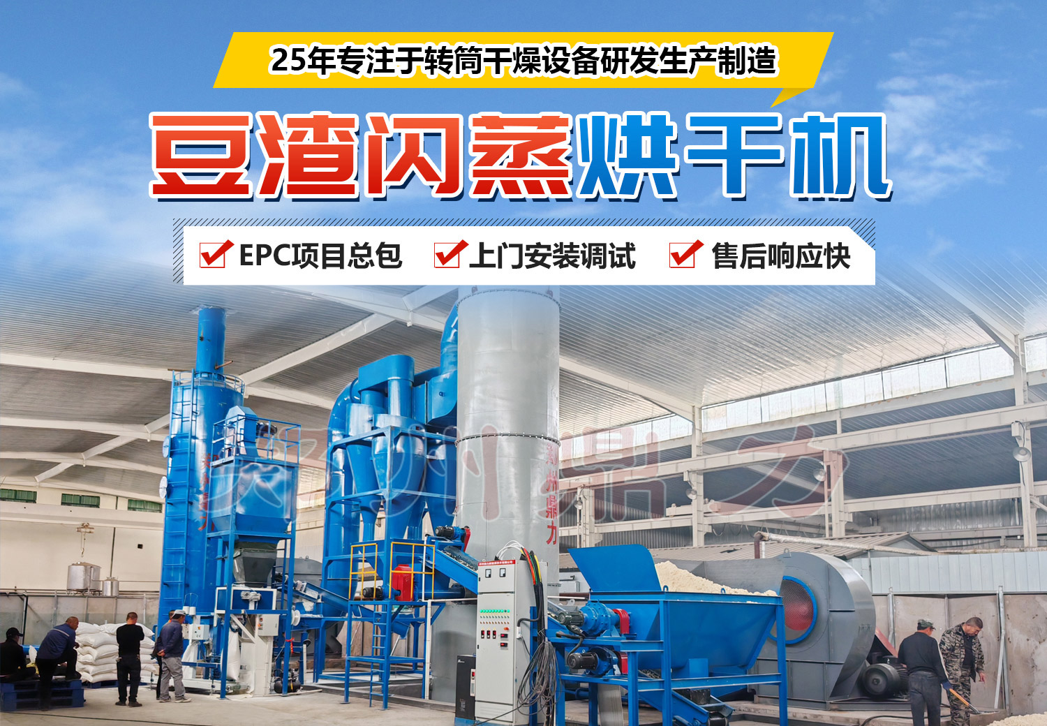 豆渣閃蒸烘干機由干燥主機、加料器、熱源裝置(熱風爐或蒸汽)、空氣過濾器、鼓風機、旋風分離器、布袋除塵器、引風機等關鍵部件組成。熱空氣切線進入干燥器底部,在攪拌器帶動下形成強有力的旋轉風場。豆渣由螺旋加料器進入干燥器內,在高速旋轉攪拌槳的強烈作用下,物料受撞擊、磨擦及剪切力的作用下得到分散,塊狀物料迅速粉碎,與熱空氣充分接觸、受熱、干燥。脫水后的干物料隨熱氣流上升,分級環將大顆粒截留,小顆粒從環中心排出干燥器外,由旋風分離器和除塵器回收,未干透或大塊物料受離心力作用甩向器壁,重新落到底部被粉碎干燥。
