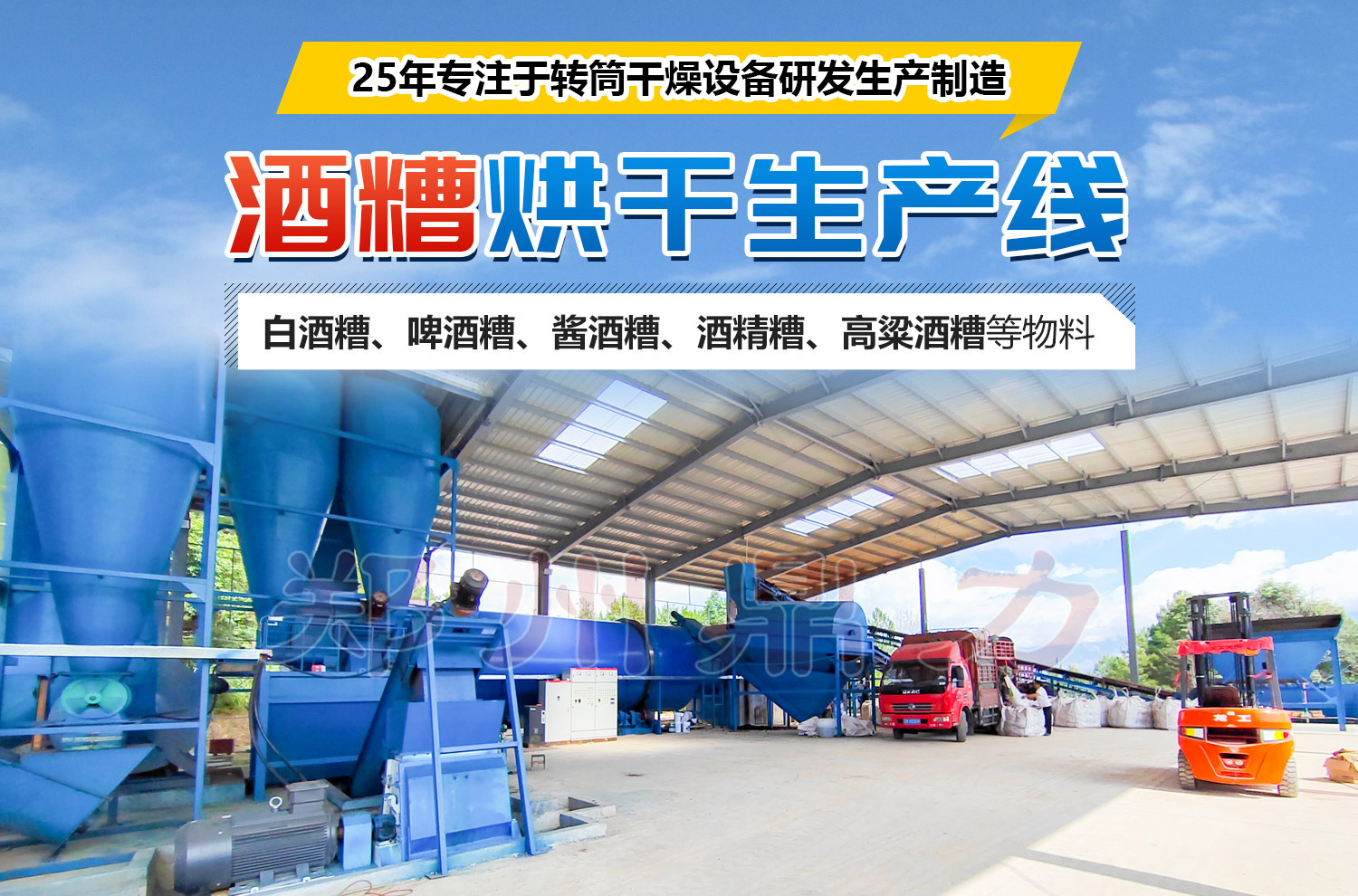 物料流程是:水分60-65%的白酒糟螺旋輸送機送入攪拌滾筒烘干機實現順流烘干,物料在抄板下不斷抄起、散落呈螺旋行進式前進,內置多層抄板結構將物料充分攪拌分散拋撒,物料與熱氣充分質熱交換,水分迅速蒸發汽化,達到干燥效果的物料在熱風作用下快速行進排出滾筒,沒有達到干燥效果的濕物料因自重而不能快速行進,物料在滾筒內進行充分干燥,由此達到干燥效果,完成干燥過程,由螺旋輸送機排出。滾筒內部安裝有震打清理裝置,防止物料與筒壁粘接。氣體流程是:空氣經熱風爐鼓風機加壓進入熱風爐燃燒加熱,溫度達到600-950℃,被烘干機后引風機吸入烘干機烘干物料、蒸發水分,經過三層換熱,風溫溫度降低到55-60℃排出烘干機,含塵濕氣經過旋風除塵器收塵、濕式除塵器凈化達標排放。