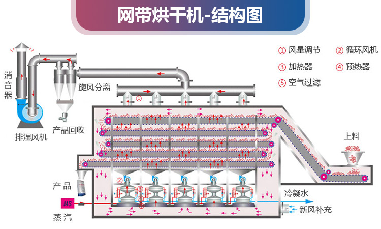 物料由給料機均勻地放置在網帶上。網帶一般采用12-60目不銹鋼絲網,通過傳動裝置在干燥機內牽引移動。干燥器由幾個單元組成。對于每個機組,熱空氣單獨循環(huán)。一些排出的氣體用專門的除濕鼓風機排出。廢氣通過調節(jié)閥進行控制。熱空氣從上到下或從下到上穿過覆蓋有材料的網帶,這將完成傳熱和傳質過程。這個過程會帶走材料中的水分。網帶移動緩慢,運行速度可根據物料溫度自由調節(jié)。干燥后的最終產品將連續(xù)落入物料收集器中。上下循環(huán)機組可根據用戶需求自由配置。單元編號可以根據需求進行選擇。