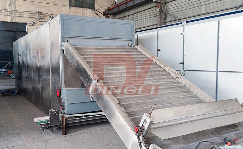 物料經(jīng)給料機均勻地放置在網(wǎng)帶上。網(wǎng)帶一般采用12-60目不銹鋼絲網(wǎng),通過傳動裝置在干燥機內(nèi)牽引移動。干燥器由幾個單元組成。對于每個機組,熱空氣單獨循環(huán)。一些排出的氣體用專門的除濕鼓風(fēng)機排出。廢氣通過調(diào)節(jié)閥進(jìn)行控制。熱空氣從上到下或從下到上穿過覆蓋有材料的網(wǎng)帶,這將完成傳熱和傳質(zhì)過程。這個過程會帶走材料中的水分。網(wǎng)帶移動緩慢,運行速度可根據(jù)物料溫度自由調(diào)節(jié)。干燥后的最終產(chǎn)品將連續(xù)落入物料收集器中。上下循環(huán)機組可根據(jù)用戶需求自由配置。單元編號可以根據(jù)需求進(jìn)行選擇。